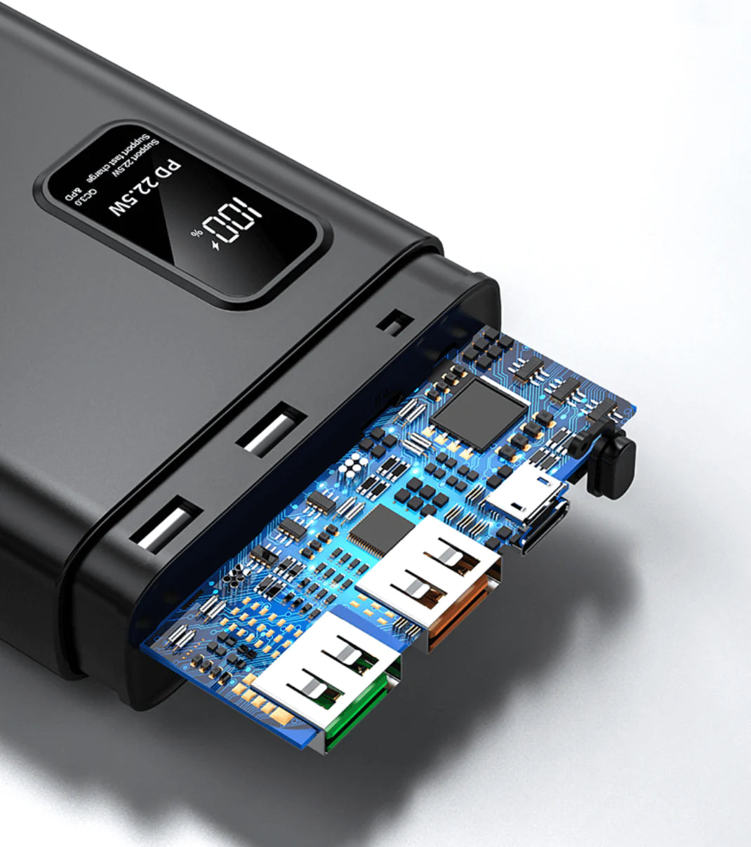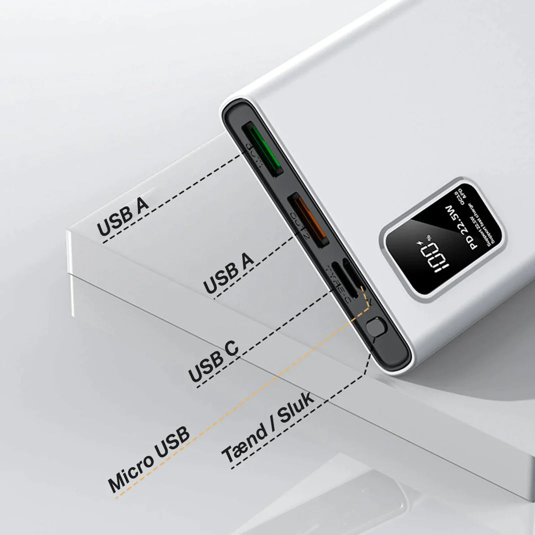 Vores powerbanks har som minimum 4 udgange - her kan du vælge imellem alle typer USB, især USB C er vigtig da den passer til alle nye telefoner, og fungerer som både en indgang og udgang.